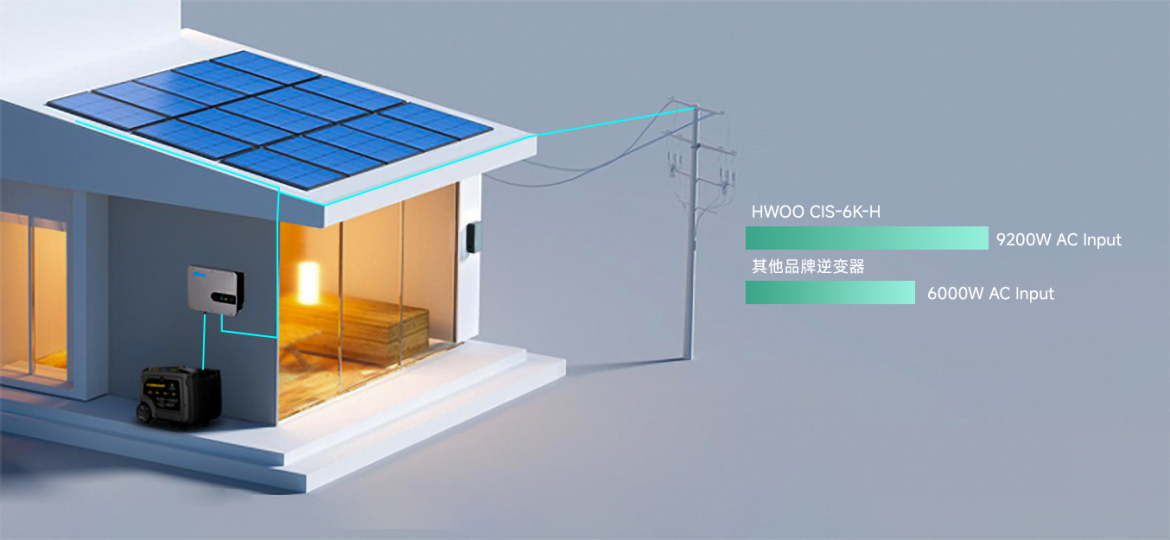 The HWOO hybrid inverter is designed with dual high-efficiency inputs, allowing it to seamlessly combine solar power and grid or diesel generator input. This design ensures that when solar generation is insufficient, the inverter can still draw from other sources, keeping the energy supply stable. With a DC input of 9600W, it can connect to powerful solar panels, ensuring more energy is harnessed from the sun.